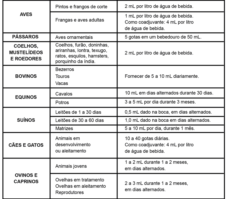 Indicado na recuperação rápida do cansaço de viagens e em outras situações estressantes como: vacinações, debicagem, mudanças de alojamento, superprodução; para acelerar o crescimento através de melhor índice de conversão alimentar; Prevenção de carências vitamínicas do complexo B; na melhora da fertilidade, eclosão de ovos e do metabolismo, mantendo o alto nível de produção de leite, carne, ovos e lã.