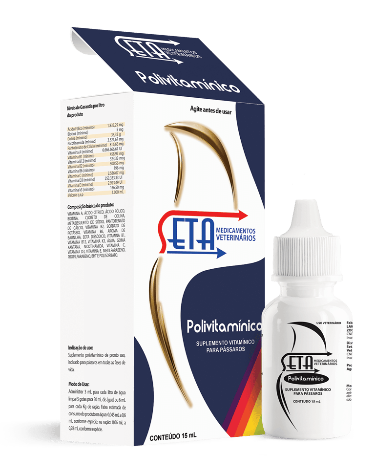 SETA Polivitamínico é um produto adequadamente balanceado que reúne vitaminas suplementares para Pássaros em todas as fases de vida.” CARACTERÍSTICAS E INDICAÇÕES Composto por mais de 20 nutrientes reidratantes. Perfeitamente equilibrado para uso oral e diário. Durante o período de canto. Polivitamínico com altas concentrações e disponibilidade de vitaminas. Indicado para suprir as necessidades nutricionais das aves das carências de vitaminas e nas situações onde haja um aumento da demanda nutricional de vitaminas.